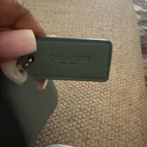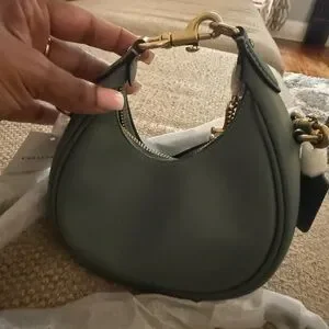 Coach mini crescent shoulder bag in sage Curved silhouette with gold-tone hardware. Zip top closure and short shoulder strap. Sleek, minimalist design with subtle branded details.