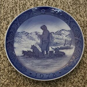 Decorative collector plate featuring a winter sled dog scene. Blue and white color palette with detailed border. Year "1978" displayed on front. Ready for display or collection.