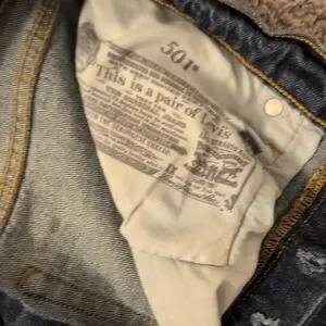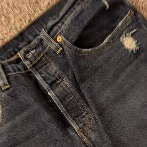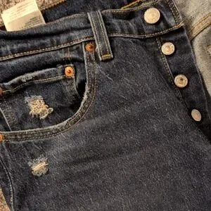 Classic Levi's. Blue denim with subtle distressing at pockets. Button-fly front. Clean, versatile style for everyday wear.