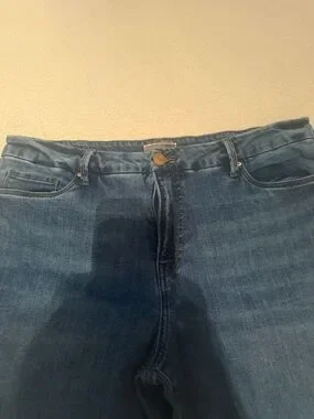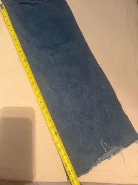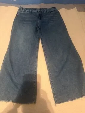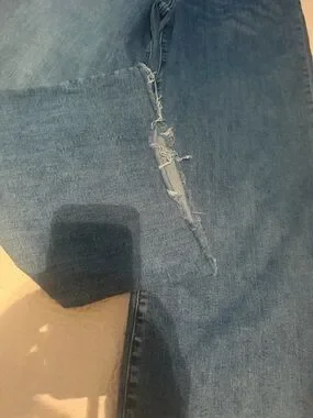 Straight-leg women's jeans with a roomy fit. Medium blue denim with subtle fading. High-rise waist and full-length legs. Raw hem detail for a relaxed look.