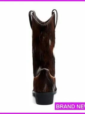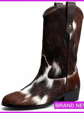 Genuine Cowhide Leather Cowboy Boots Mid-Calf Western Pull-On Festival Fashion