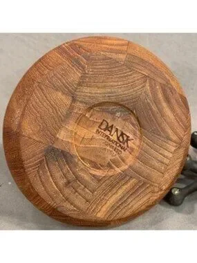 A vintage teak candle holder from Dansk International Designs, attributed to designer Jens Harald Quistgaard. This piece features staved teak wood construction with a recessed brass candle cup insert. Quistgaard served as head designer at Dansk from 1954 through the 1980s.