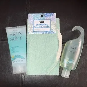Refreshing Skin So Soft body gellied body oil 6.7oz and 5oz body wash. Comes with a mint green exfoliating stretch cloth. Gentle scent and lightweight formulas. Great for daily shower care.