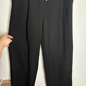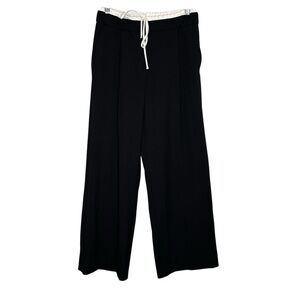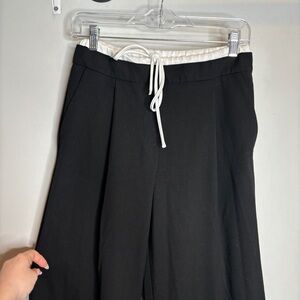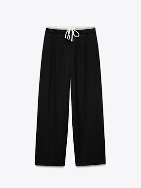 Chic, modern trousers from Zara featuring a unique double waistband detail with adjustable drawstring. Designed with a relaxed wide-leg silhouette and tailored front darts, these pants blend comfort with a polished, elevated look—perfect for everyday wear or dressing up.