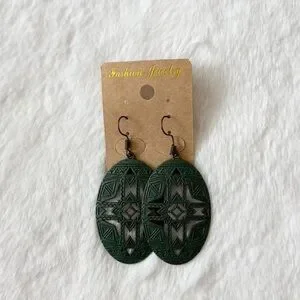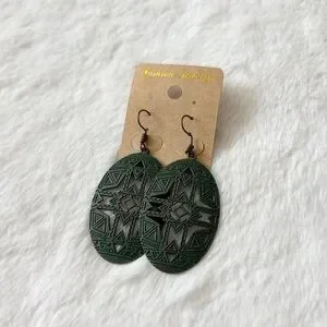 Stylish green oval drop earrings with an intricate geometric cutout design. Lightweight and easy to wear for everyday or special occasions. Features a classic hook for comfortable wear. Green color adds a versatile, natural touch to any outfit. Brand: Fashion Jewelry.
