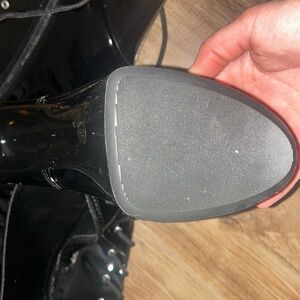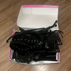 Sleek black patent thigh-high boots with lace-up front and side zipper for easy wear. High platform and stiletto heel deliver bold height and dramatic style. Perfect for statement looks and night outings.