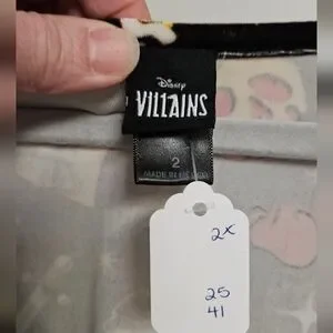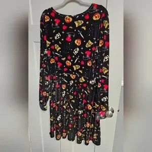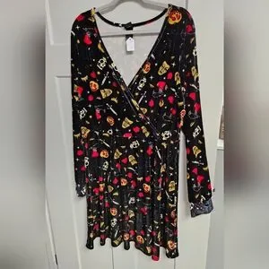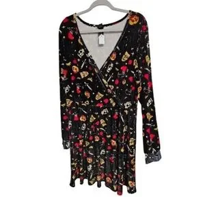 Disney long-sleeve wrap dress in black with red and gold print. V-neck wrap front creates a flattering silhouette. Soft, drapey fabric for easy movement. Playful motif adds character to the look.