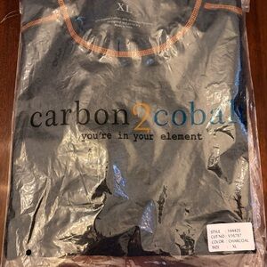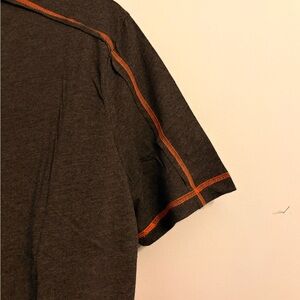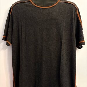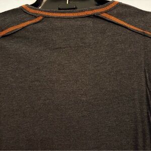 Carbon2Cobalt, men's crew neck shirt in dark gray heather with contrasting orange stitching. Lightweight and breathable. Clean, modern silhouette that layers easily. Features orange accents at collar, shoulders, and sleeve hems for subtle style. New. Opened package to take photos.