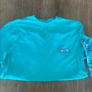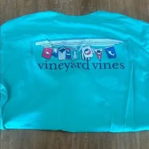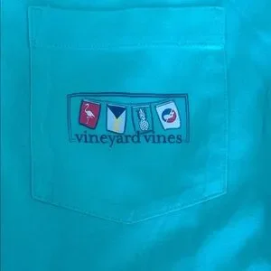 like New! Aqua long sleeve tee by Vineyard Vines. Features a classic pocket design with a printed sleeve logo and back design. Unisex