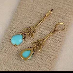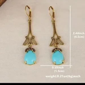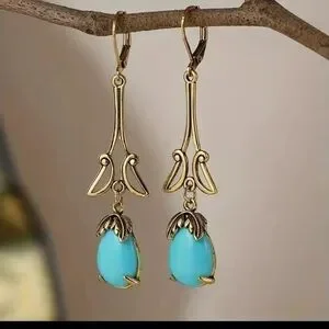 Delicate gold-tone drop earrings featuring vibrant turquoise teardrop stones. Lightweight and elegant for day-to-night wear. Turquoise color adds a fresh, eye-catching pop while the gold finish provides a refined look.