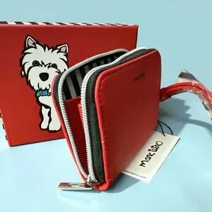 Vibrant red wallet with a cute white dog print. Features a secure zipper closure and keychain/wristlet attachment. Signature on front and back. New condition with tag and in box.