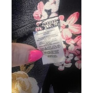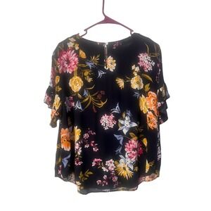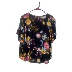 Keywords: LOFT, floral blouse, women's top, ruffle sleeve, printed blouse, casual top, round neck, short sleeve blouse, floral print, dark floral