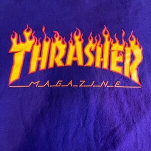 Ignite your streetwear rotation with this iconic Thrasher Magazine flame logo tee, featuring a bold purple hue that demands attention. The classic fire graphic across the chest brings an unmistakable energy, perfect for those who live the skate lifestyle or just appreciate authentic counter-culture style. Crafted from soft, breathable cotton, this shirt offers a comfortable fit that feels like an old favorite from the first wear. This item is in excellent pre-owned condition, showing only light signs of gentle wear that add to its authentic character. Ideal for skate sessions, casual hangouts, or music festivals.