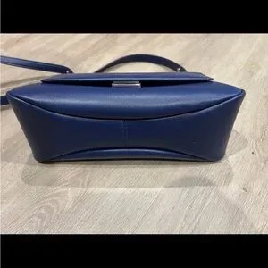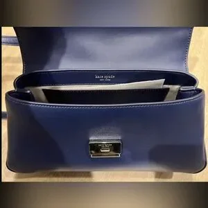 Sleek kate spade shoulder bag in rich navy leather. Smooth flap with subtle logo stamp. Adjustable strap for shoulder or crossbody wear. Minimalist shape with clean lines.