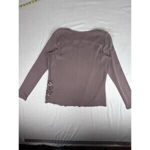 Gently used pullover Organic Cotton waffle knit long sleeve t-shirt with scoop neck and embroidered flowers. No rips, tears or stains. Please look at the photos as they are part of the description.This would be a great shirt for bonfires, BBQ's, hiking in the mountains, or wearing to work.