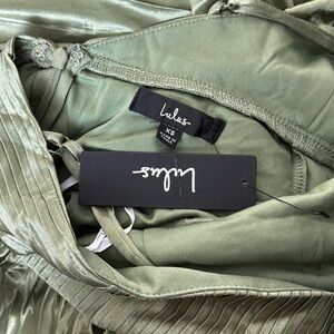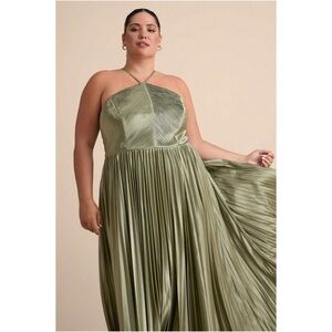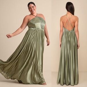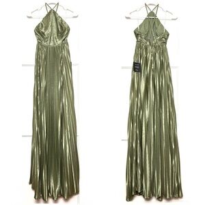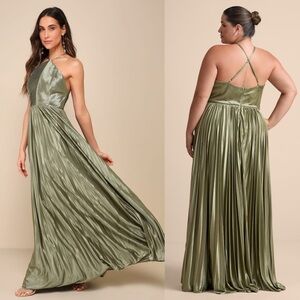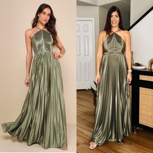 LULUS Olive Satin Pleated Sleeveless Halter Neck Wedding Guest Formal Gown XS