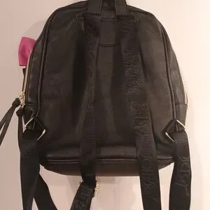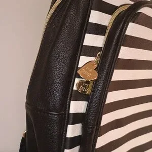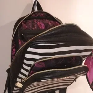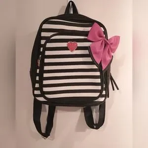 Y2K Betsy Johnson Charming backpack featuring black and white stripes with a bright pink bow accent. Designed for everyday use with a front zip pocket and adjustable straps. Lightweight and stylish for school or outings.