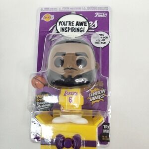 Funko Popsies LeBron James vinyl figure captures the Lakers superstar in his iconic number 6 jersey, holding a basketball. This interactive pop-up greeting features a surprise message bubble that reads "YOU'RE AWE INSPIRING!" when the center bow is pressed. Designed with the classic Funko aesthetic, this collectible stands on a yellow and purple base, making it a perfect gift or display piece for any NBA fan. The figure remains sealed in its original blister card packaging, preserving its condition for collectors.