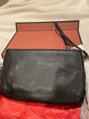 Coach wristlet in black pebbled leather. Silver turnlock closure on front. Removable leather wrist strap. Compact and elegant carry option. Comes in box