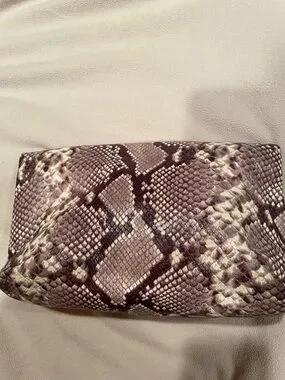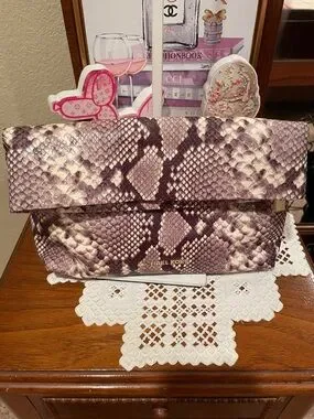 Stylish foldover clutch in snake-print leather. Subtle gold logo hardware. Textured finish with soft brown and tan tones. Sleek silhouette for evening or day looks.