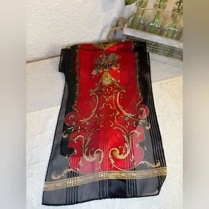 Red, black, and gold silk scarf with floral, filagree and vase motif. 53” x 10”