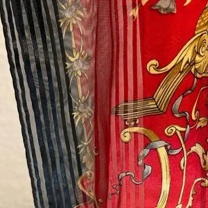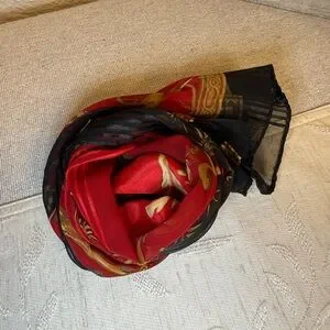 Likely vintage red, black, and gold silk scarf with a floral vase motif. Pre-owned, well cared for . No tag, is likely silk. Can be folded in half and used as a neck or head scarf. Scranton not included.