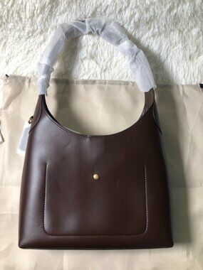 Classic Coach shoulder bag in smooth dark brown leather. Subtle gold Coach logo on front. Clean, curved silhouette with a comfortable top handle. Versatile style for everyday and dressy looks. New Coach Brooklyn 28 bag