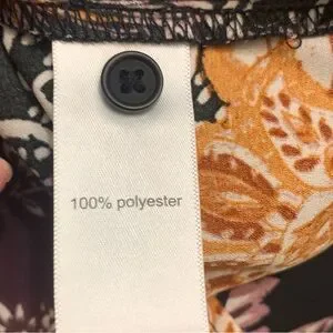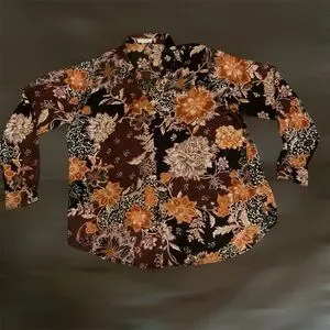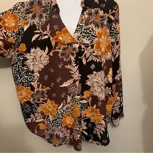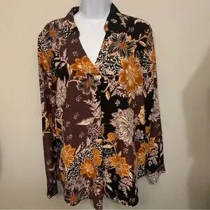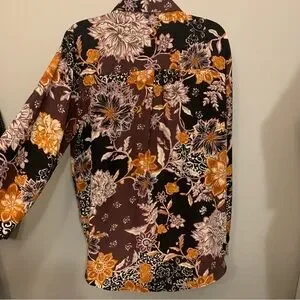 Stunning floral print blouse with a plum and black background with vibrant gold florals. Long sleeve top features a relaxed fit, collared neckline, soft lightweight fabric and button cuffs. Slightly rounded hem. Perfect for work with dress pants and heels or casual outings with jeans and flats. Chic, feminine, and versatile. Worn once. Bust approx 44”. Length 28”.