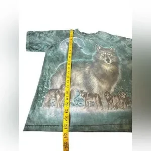 Classic 90s-style wolf graphic tee with a howling wolf + pack scene and a faded green tie-dye wash. Perfect worn-in look.
