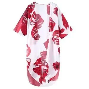 White Red Floral Open Front Long Kimono Robe Cover Up NEW