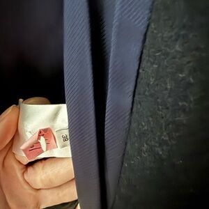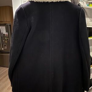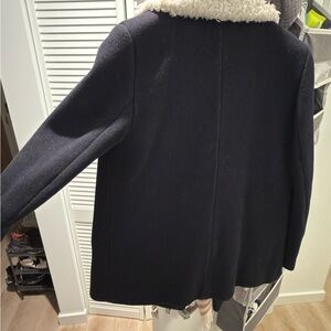 Double-breasted navy peacoat by Sandro. Cream sherpa collar adds cozy texture. Tailored silhouette with classic button details. Lined interior for warmth and structure.