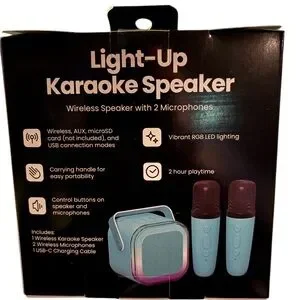 Enjoy endless fun with this Light-Up Karaoke Speaker featuring wireless microphones. Perfect for parties and gatherings, this speaker delivers high-quality sound and vibrant lighting effects. The sleek black design adds a modern touch to any setting.