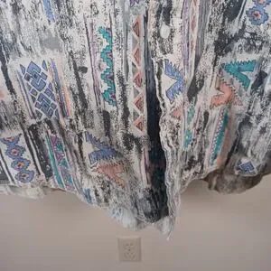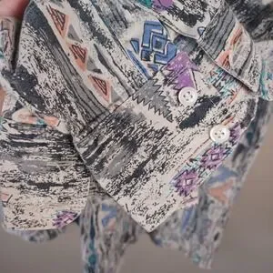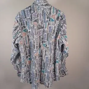 Details: long sleeve cowboy cut, good vintage condition, Novelty Geometric print, made in USA, size 17/XL