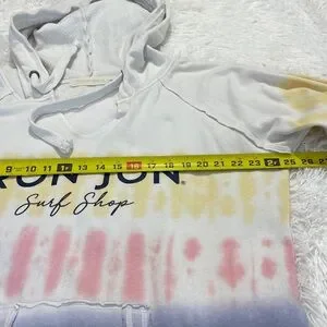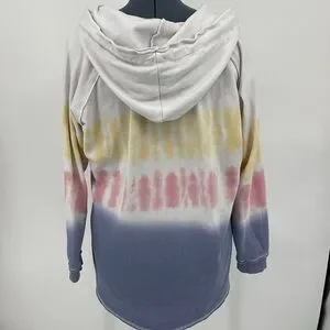 Cozy tie-dye hoodie with front pocket. Features Ocean Drive branding. Perfect for casual wear. VERY GOOD PREOWNED 60 COTTON, 40 POLYESTER
