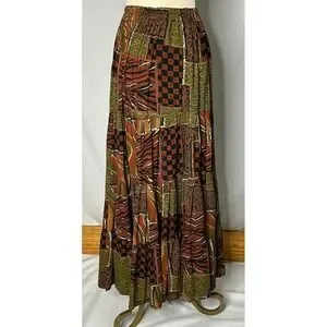 Silk Stop Originals Boho Patchwork Maxi Skirt Brown Green Earth Tones Size S
