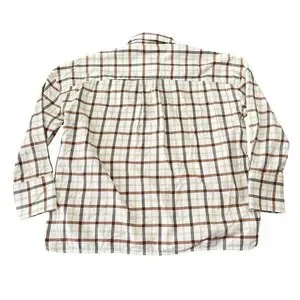 Everlane flannel shirt in a versatile cream, brown, and sage green plaid pattern. Crafted with a relaxed, oversized fit, this long-sleeve button-down features a classic pointed collar and two large chest patch pockets. The dropped shoulder design and curved high-low hem add a modern silhouette to this cozy, ethically made staple. Finished with adjustable button cuffs and a full-length button placket, it is perfect for layering or wearing on its own.