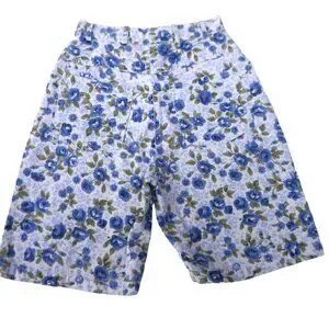 Vintage Erika Floral Denim Bermuda Shorts. Ultra High Waist. YKK Zip Fly Pockets. Optional Roll Cuff. White Purple Green Turkish Cotton. Made in Turkey. Tagged Vintage Sizing 6. Measures Modern US Size 25" Waist.