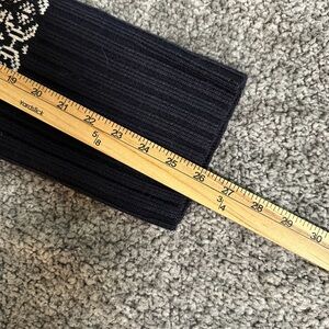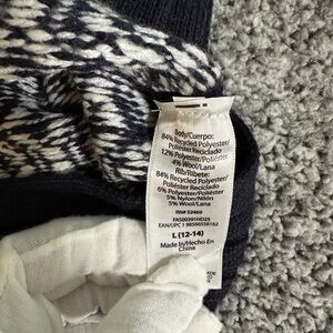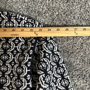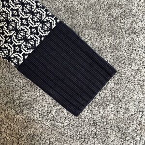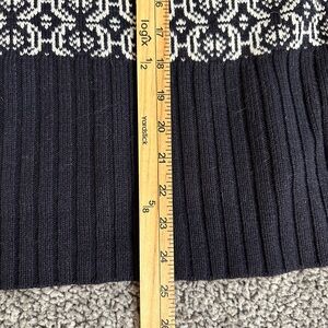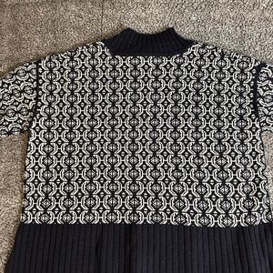 This cozy, elevated knit features a classic navy and white geometric design with a chunky ribbed mock neck and hem—perfect for effortless, put-together winter style. Polyester and wool blend, ideal for layering.
