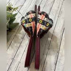 The Kensington Flat Sandal is crafted from multiple embroidered fabrics woven across each other. There is an antiqued silver eagle head sat on the strap and the footbed is in an eggplant shade.