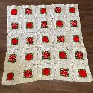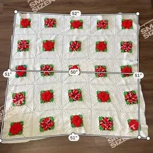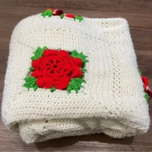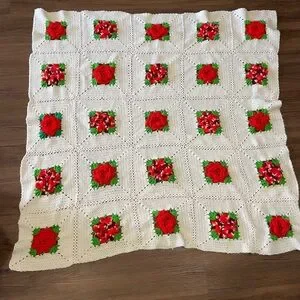Crocheted Afghan Throw Blanket 3D Red Roses Granny Squares 51” X 52”