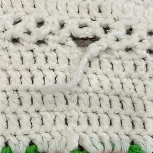 Crocheted floral square featuring a textured red rose with green leaves. White background stitches frame the flower. Bold, dimensional applique perfect for crafting or quilting projects.