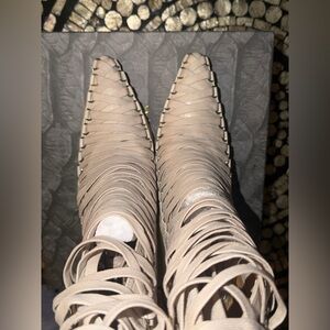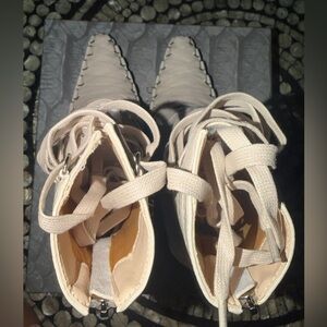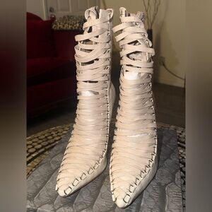 Azalea Wang “Sniper” Croc-Embossed Lace-Up Stiletto Boot in Beige