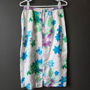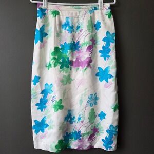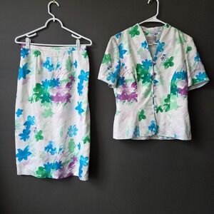 Vintage Adrianna Papell 100% Silk Floral Skirt Set Blue Green Purple Womens 8