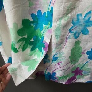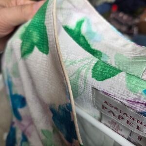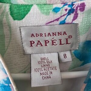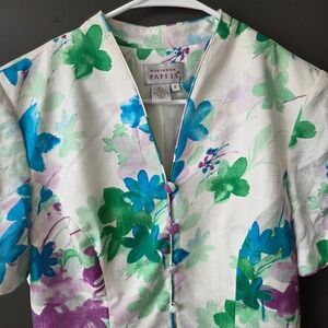 Vintage Adrianna Papell two-piece skirt set crafted from 100% silk with a full acetate lining. This elegant ensemble features a short-sleeve button-front blazer and a matching midi-length pencil skirt, both adorned with a vibrant watercolor floral print in shades of blue, green, and purple. The top is designed with a unique V-neckline, structured seams for a tailored fit, and decorative fabric-covered buttons. The skirt offers a clean silhouette with a rear elastic waistband for comfort and a back slit for ease of movement. Please note there is a bit of discoloration along the neckline as shown in the photos.