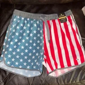 Patriotic swim trunks with star and stripe pattern. Elastic waist with drawstring. Lightweight, quick-dry fabric. Side pockets and contrast trim. Bold red, white, and blue colorway.