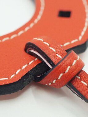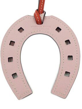 This is an authentic Hermès Padlock Horseshoe charm in pink and orange leather. The charm features a horseshoe shape with decorative metal hardware and a sturdy leather strap for attaching it to a bag or other accessory.