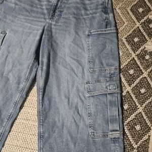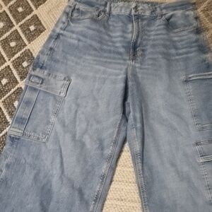 Trendy wide leg jeans with cargo pockets. Light blue denim for a casual look.