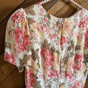 Tags- flowers bloom warm tones pink stem bees petals airy breathable soft feminine girly butterfly sleeves pastel pale yellow carnation pink dark print colorful bountiful