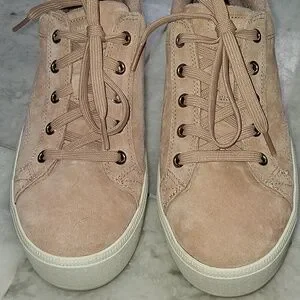 Low-top platform sneakers in rose suede. Lace-up style with thick cream platform sole. Minimal metal logo stud on side. Versatile casual look. Almost new. Worn 1 day.