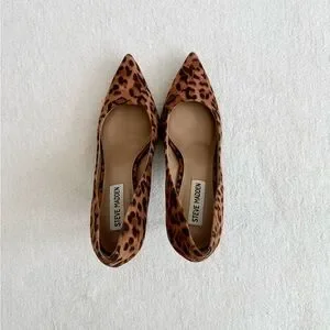 Chic and bold Steve Madden leopard print pointed‑toe pumps featuring a sleek silhouette and a comfortable stiletto heel. Smooth interior for easy wear. Striking pattern to elevate outfits. Perfect for work, date nights, parties, and statement outfits.